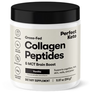 Collagen Peptides & MCT | Low-carb protein + support | Grass-fed collagen + MCT | Versatile; mixes in smoothies/coffee | Not vegan; flavored options use sweeteners | Varies | Collagen + MCT] Perfect Keto |